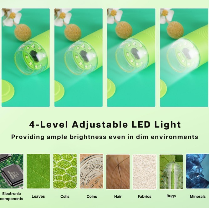 - The GreenPeek handheld microscope offers a versatile tool for young scientists with its 2-inch HD IPS screen adjustable from 45 to 90 degrees, allowing comfortable viewing without fixed posture strain. With magnification ranging from 500X to 1000X, plus an additional 4X digital zoom, it captures intricate details from leaf veins to tiny insects, fostering curiosity and fine motor skills. Its 16MP camera and 1080P video recording deliver vivid images and smooth footage. Equipped with eight LEDs featuring four brightness levels, it ensures clear visibility even in low-light settings. The included 16GB TF card stores thousands of photos or hours of video, easily transferable to a computer for sharing or educational use. Designed with a child-friendly, colorful, and lightweight build, this miniscope blends education and entertainment, making it an ideal gift to inspire young minds through hands-on discovery.